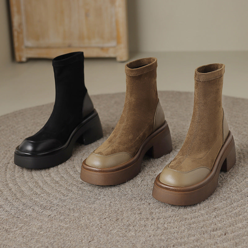 Step up your style this Fall and Winter season with these elegant Round Toe Block Heel Ankle Boots. Crafted with a sophisticated blend of premium leather and soft fabric, these boots deliver both comfort and fashion. The leather toe and heel caps add a touch of refinement, while the soft, sock-like fabric upper offers a snug and flexible fit around the ankle, providing a streamlined look that’s both chic and effortless.